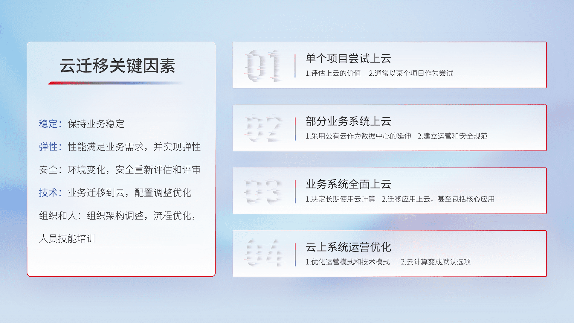 结合实际业务,,,,从规划设计、、、、云平台选型、、、、云原生改造、、、、数据迁移、、集成交付,,,迁移全过程为客户识别最佳上云路径,,,做好风险识别管理,,,,设计网络架构、、、、身份权限、、、、安全审计合规、、操作审计、、、日志审计、、、、监控告警策略、、、、多站点容灾设计等,,,,对云上基础设施进行整体规划,,,,提升IT治理水平,,,以满足弹性、、、、高可用、、、高性能的需求。。。。